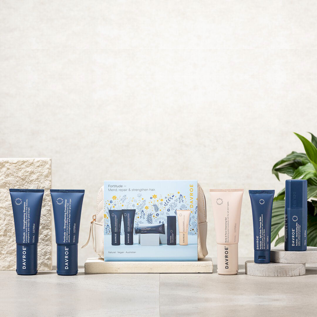 DAVROE Travel Pack Fortitude is een essentiële, compacte set met herstellende en versterkende producten om beschadigd haar overal te voeden en te beschermen. De producten zijn geformuleerd met bond-building technologie om de interne haarstructuur te reconstrueren, breuk te minimaliseren en de veerkracht van het haar te verbeteren. De set zorgt ervoor dat je haar zelfs op reis sterk, zacht en vitaal blijft.